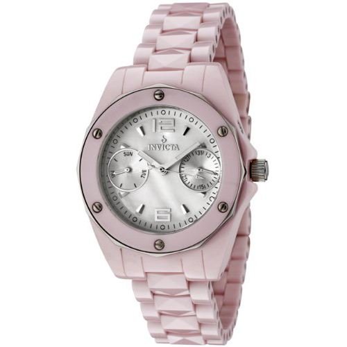 A soft pink palette charms and delights in the Invicta Women's Ceramics Collection Watch. This elegant timepiece features a durable flame-fusion crystal, shiny pink ceramic case and bracelet, and glimmering white dial. Silver-toned hands join Arabic numeral hour markers at six and twelve o'clock to provide easy reading, while day-of-the-week and date silver-toned subdials help keep your life on track. Precise Swiss quartz movement lends reliability and accuracy, and water resistance to 330 feet (100 meters) guards against wear and tear. Comfortable and easy to wear, this watch closes with deployment clasp with push-button for easy on/off. For added convenience, it arrives in a bright yellow Invicta box for easy storage and gift-giving.Available at Amazon >>Check Price Now!<<