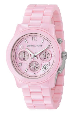 Pink ceramic case with a pink ceramic bracelet. Fixed pink ceramic bezel. Pink mother of pearl dial with luminous hands and alternating stick and Arabic numeral hour markers. Minute markers around the outer rim. Luminiscent hands and dial markers. Date display between the 4 and 5 o'clock position. Three sub-dials displaying: 60 seconds, 60 minutes and 24 hours. Japanese quartz movement. Scratch resistant mineral crystal. Silver-tone and pushers crown. Solid case back. Case diameter: 40 mm. Hidden push button deployment clasp. Water resistant at 50 mmeterts / 165 feet. Functions: hours, minutes, seconds, calendar, chronograph. Michael Kors Pink Ceramic Bracelet Ladies Watch MK5194.Available at Amazon >>Check Price Now!<<